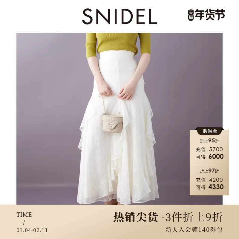 SNIDEL2025春夏新品优雅百搭高腰蕾丝钩花荷叶边半身裙SWFS252144