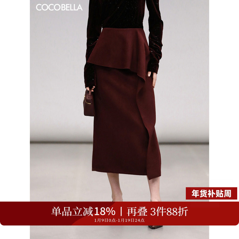 COCOBELLA不对称荷叶边半身裙女25秋新款通勤毛呢长裙HS3091-4