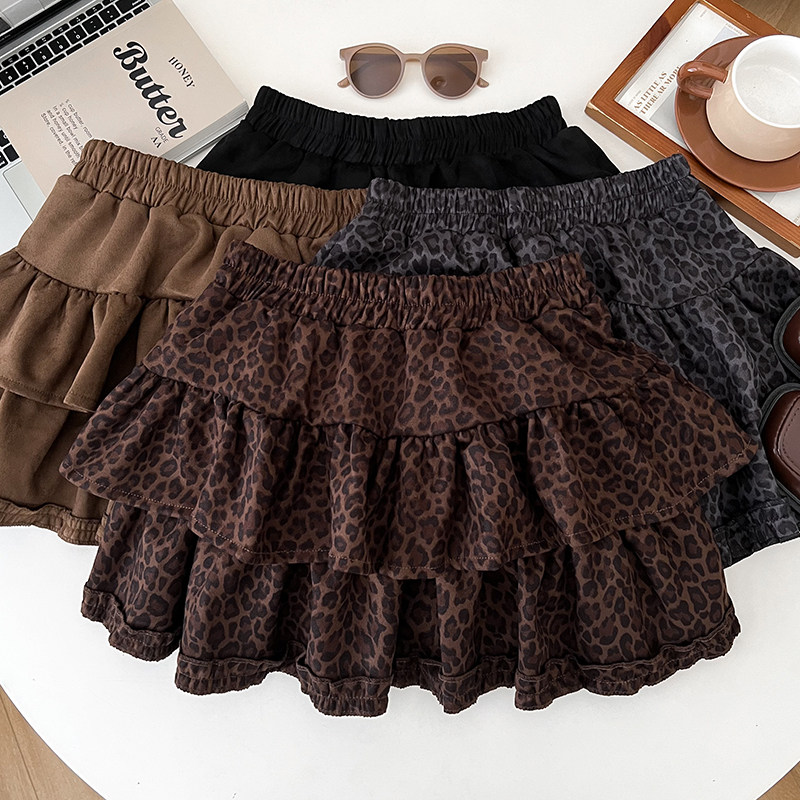 44AaSi 小嗲精 古早麂皮豹纹蓬蓬蛋糕荷叶边复古半身短裙