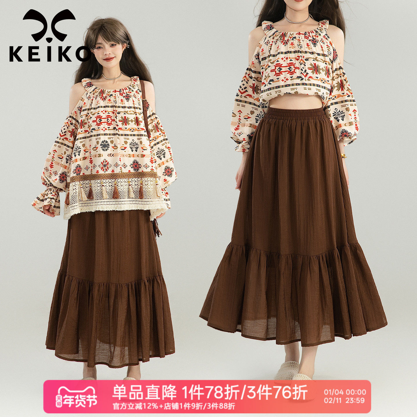 KEIKO复古咖色荷叶边半身裙26早春肌理感绉布松紧高腰a字显瘦长裙