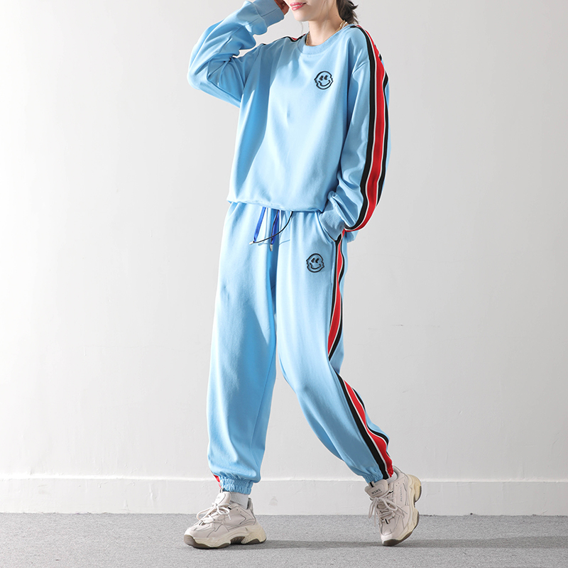 皇森休闲运动套装女2025春季新品韩版时尚侧条纹圆领卫衣两件套潮