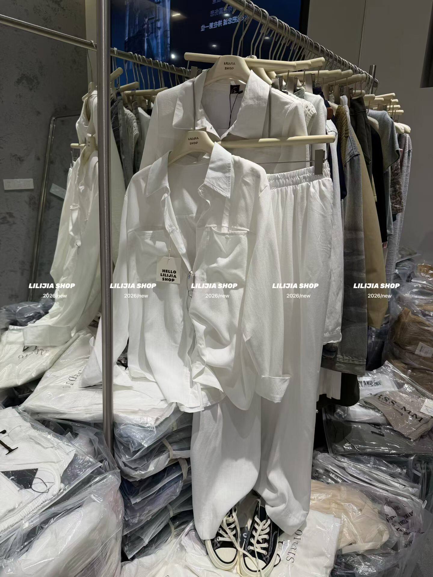 2026春季新品韩版宽松显瘦苎麻衬衣加阔腿裤两件套套装时尚减龄女