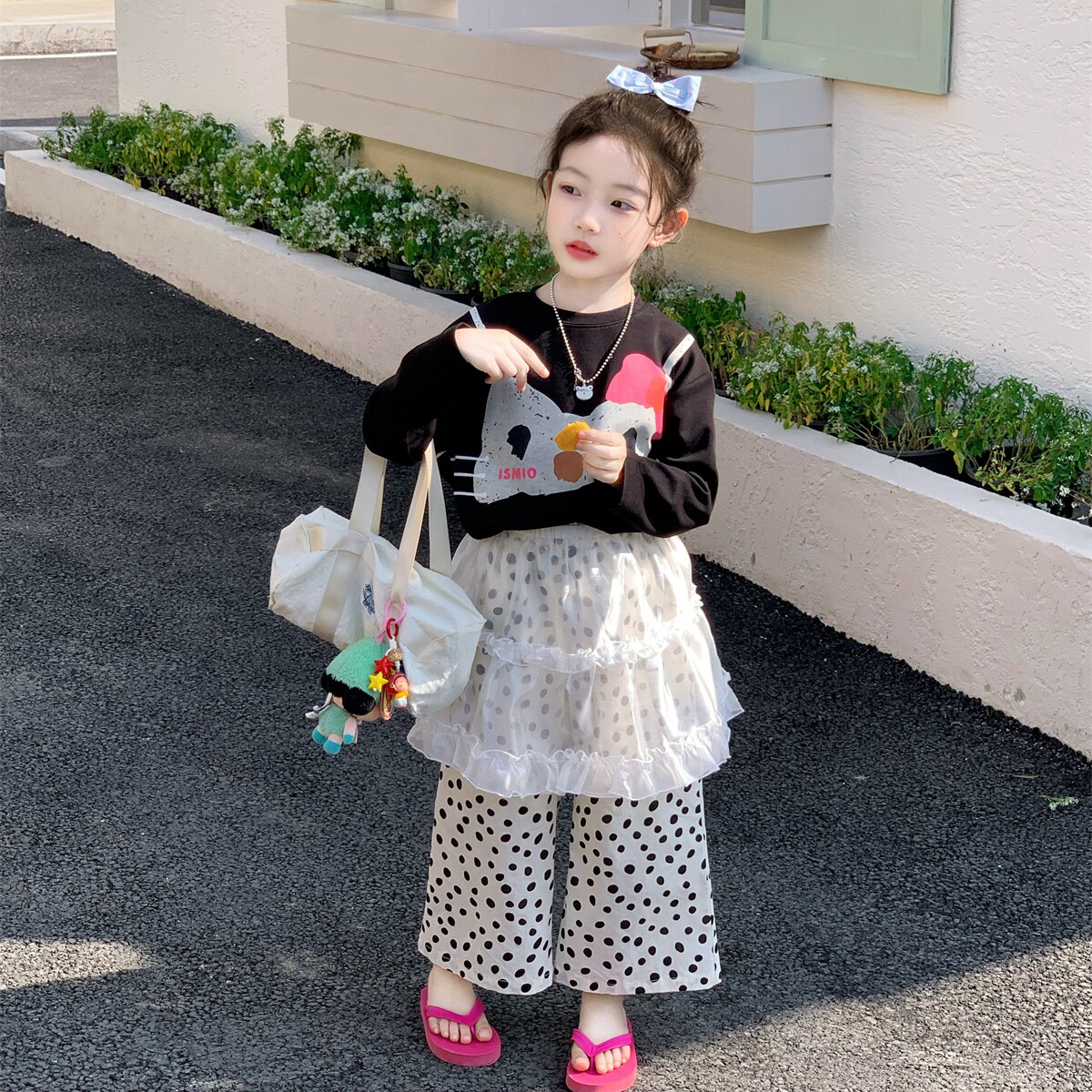 韩版女童春季卡通印花T恤波点阔腿裤两件套装2026春装新款时尚