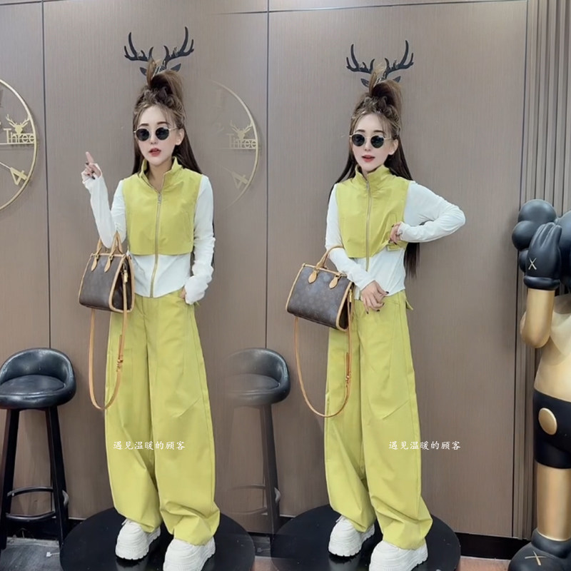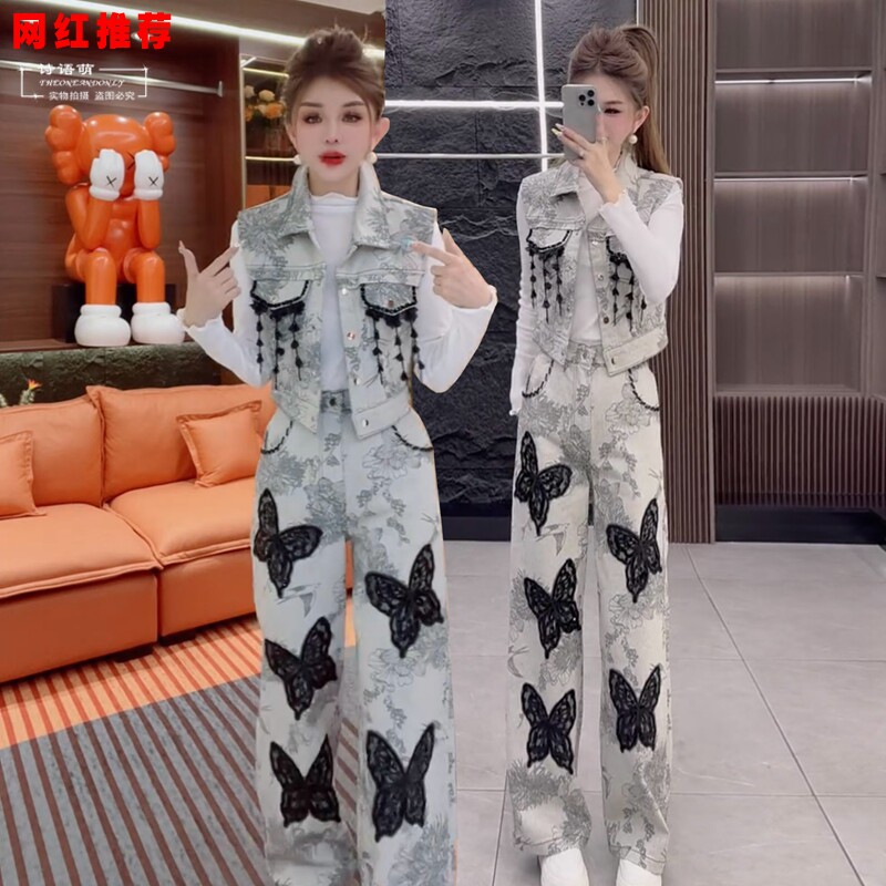 时尚套装女2026春季新款韩版洋气牛仔假两件马甲上衣阔腿裤两件套
