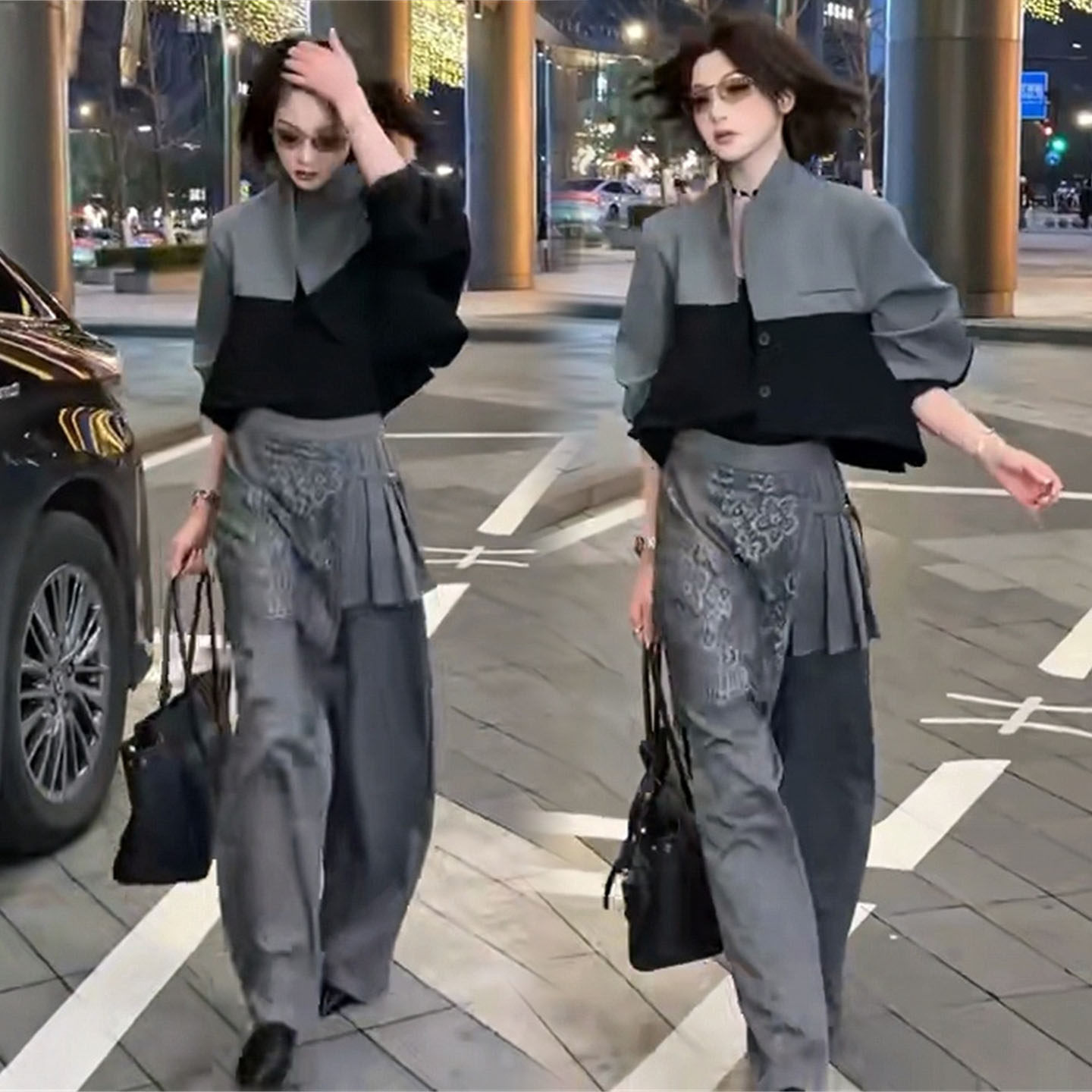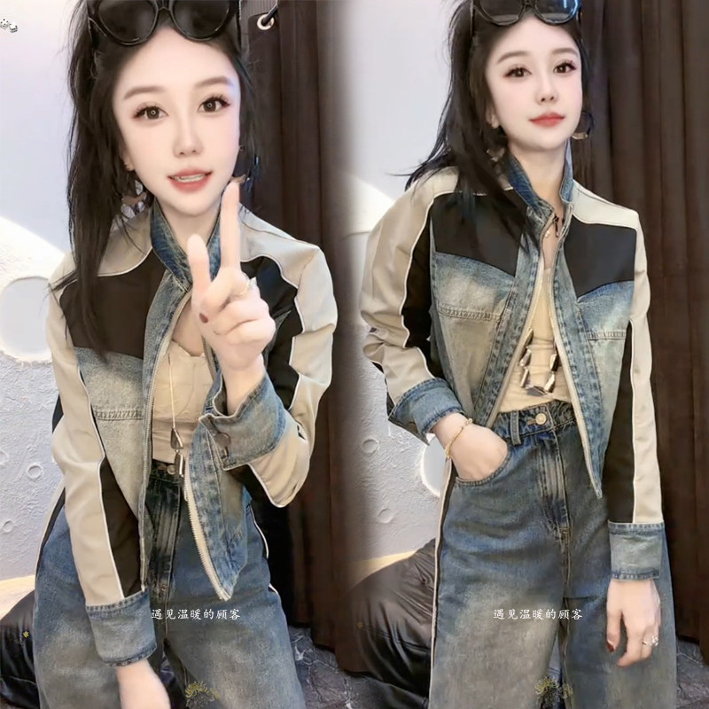 时尚套装女2026春季新款韩版牛仔拼接撞色显瘦短外套阔腿裤两件套