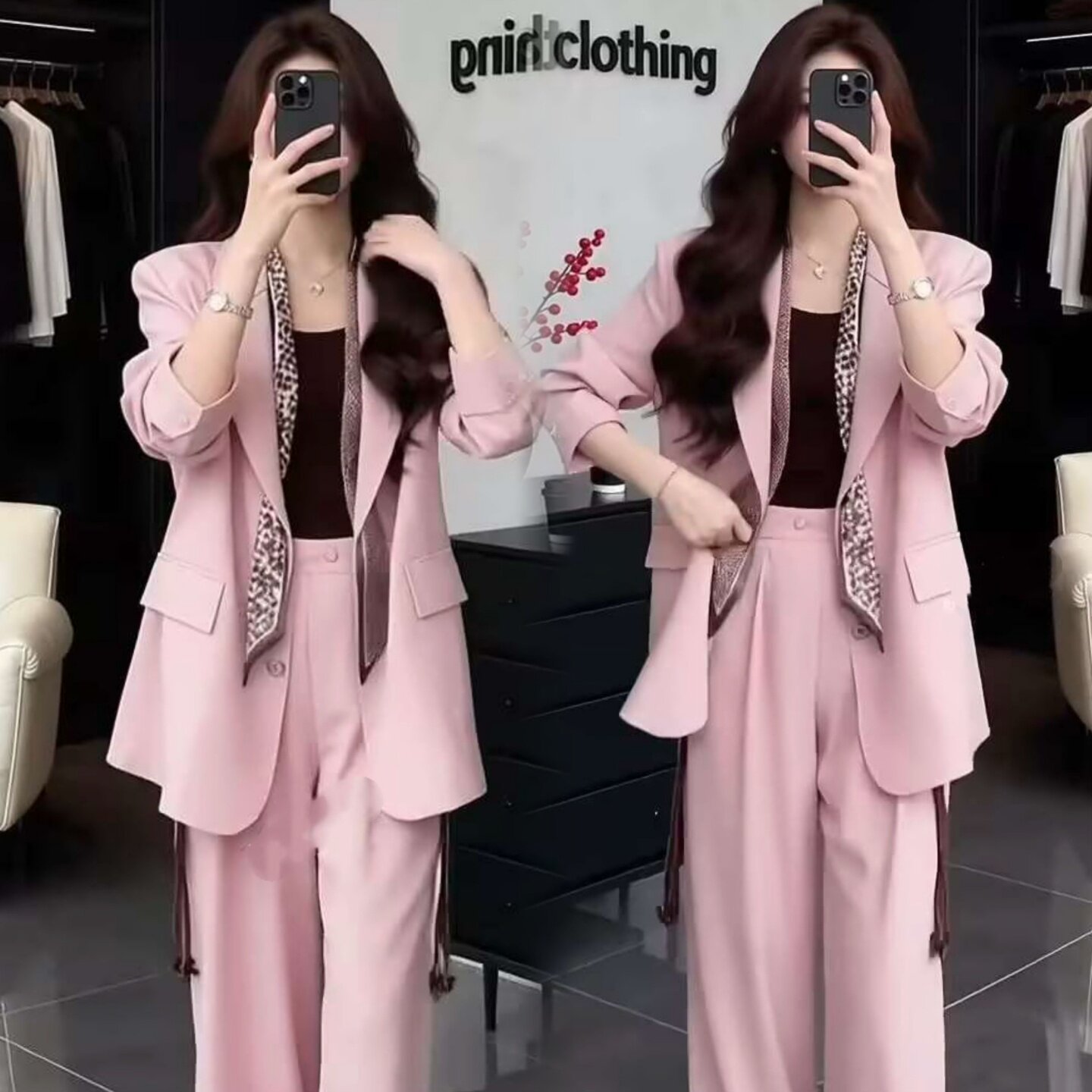 春季新款韩版简约气质减龄西服显瘦粉色西装外套阔腿裤两件套装女