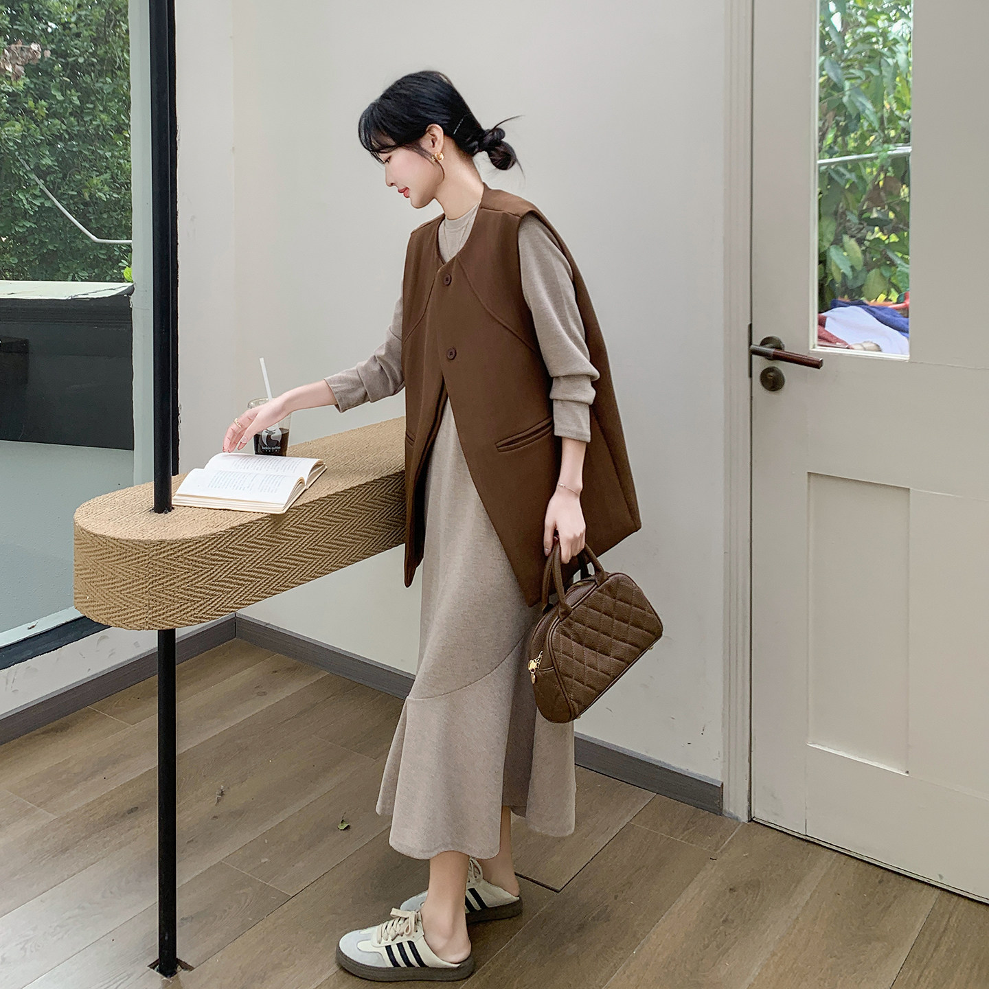 早春简约气质风长袖连衣裙套装女2026春季新款韩版时尚马甲两件套