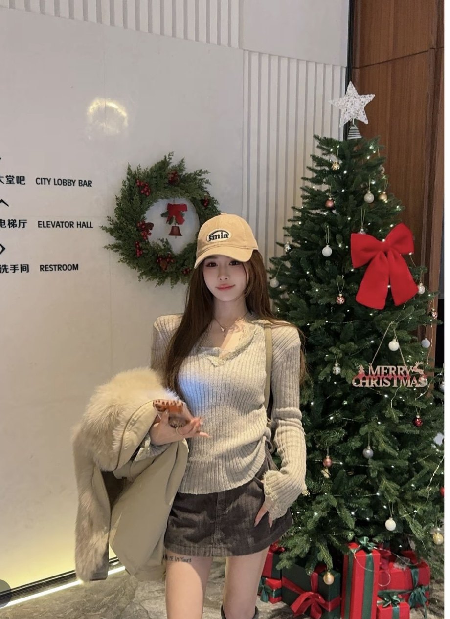 韩国东大门2025冬季新款韩版宽松V领蕾丝边时尚套头毛衣针织衫潮