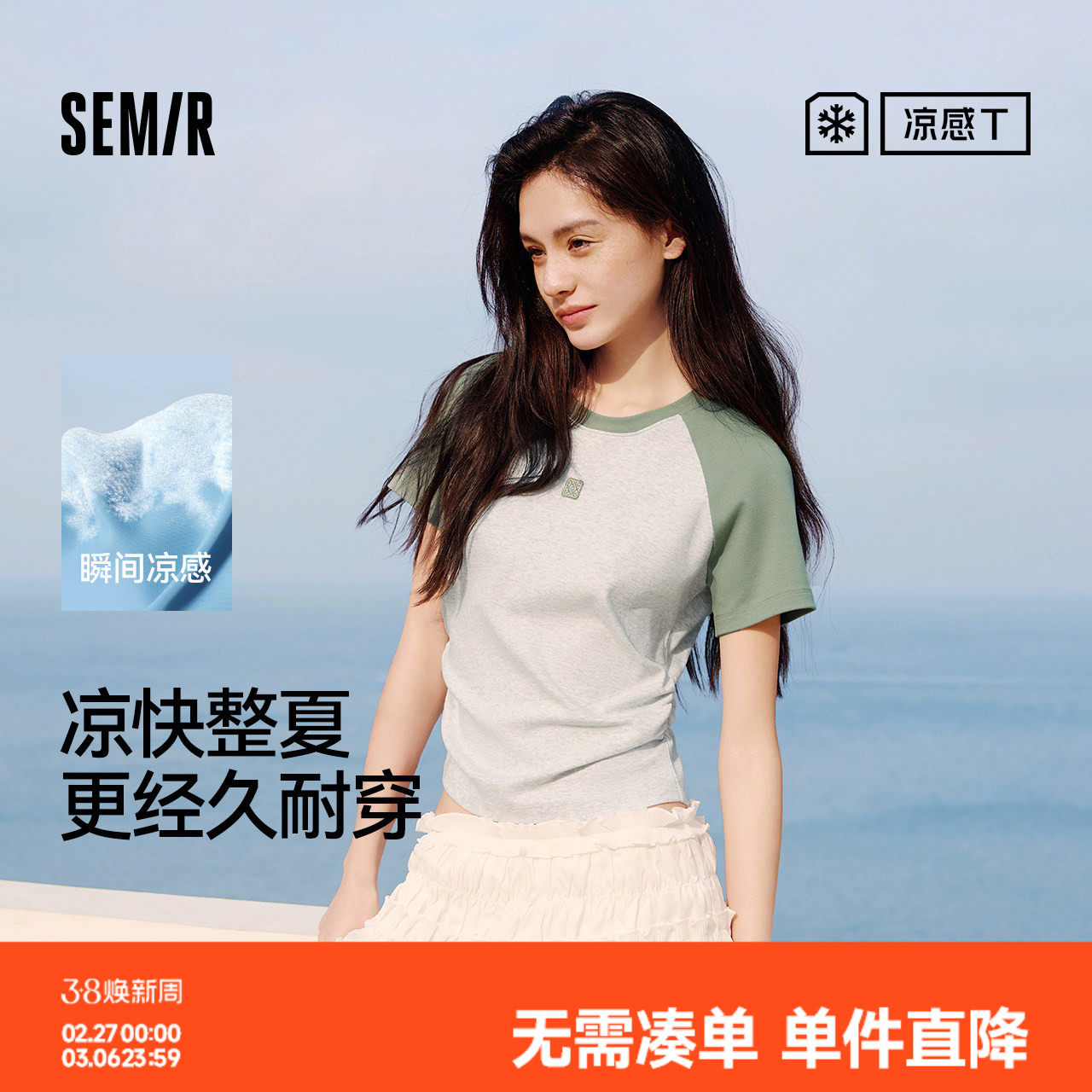 凉感T|森马短袖T恤女夏季撞色插肩袖修身褶皱刺绣显瘦小心机上衣