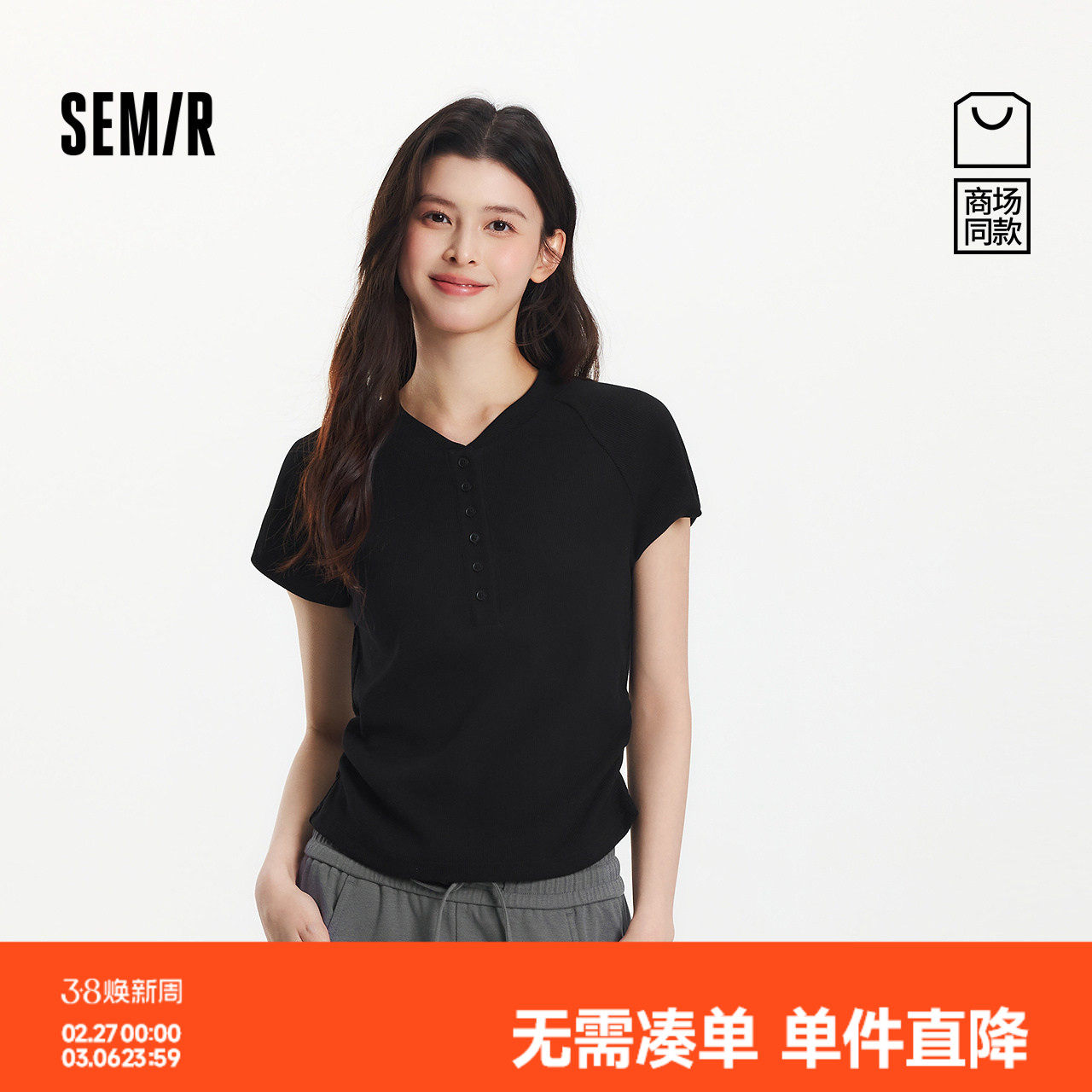 森马短袖T恤女夏季短款亨利领修身插肩袖内搭小心机显瘦百搭上衣