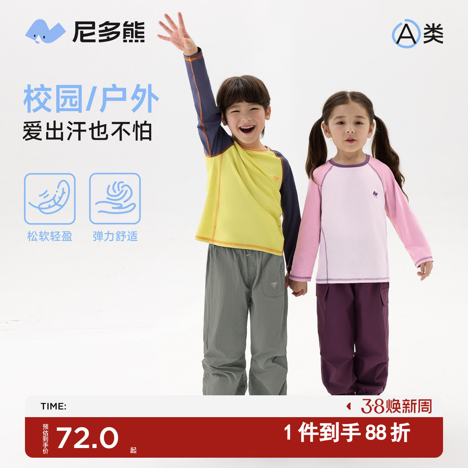 【速干】尼多熊2026春季新品儿童速干T恤撞色男女宝吸汗插肩长袖