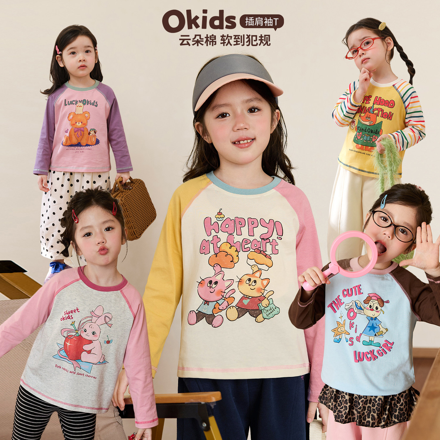 小O宝童装 宝宝长袖t恤女插肩袖2026春装新款女童100%棉卡通上衣
