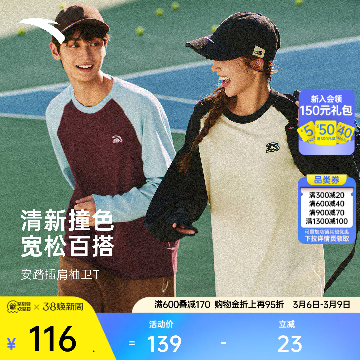 安踏长袖t恤男女春季新款撞色圆领插肩袖情侣套头衫宽松运动上衣