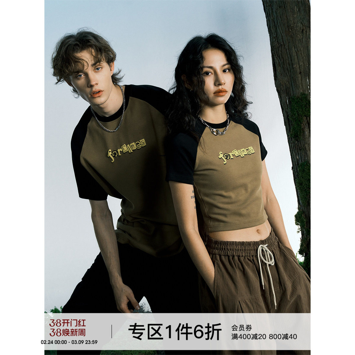 FORNINES美式复古插肩袖短款辣妹紧身短袖T恤女潮牌情侣半袖男夏