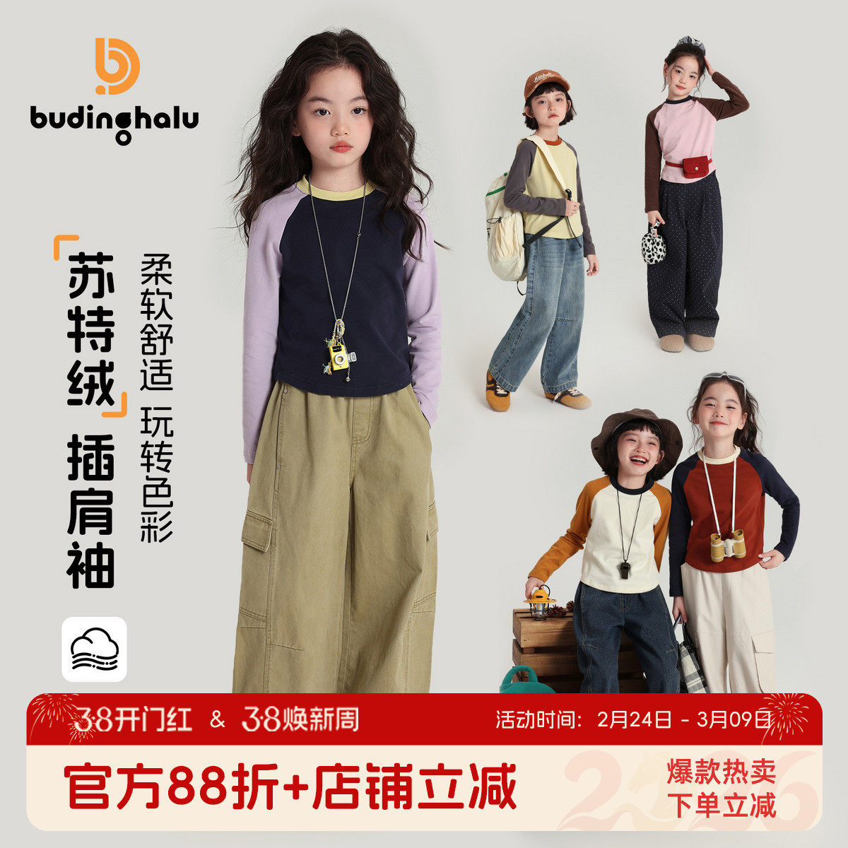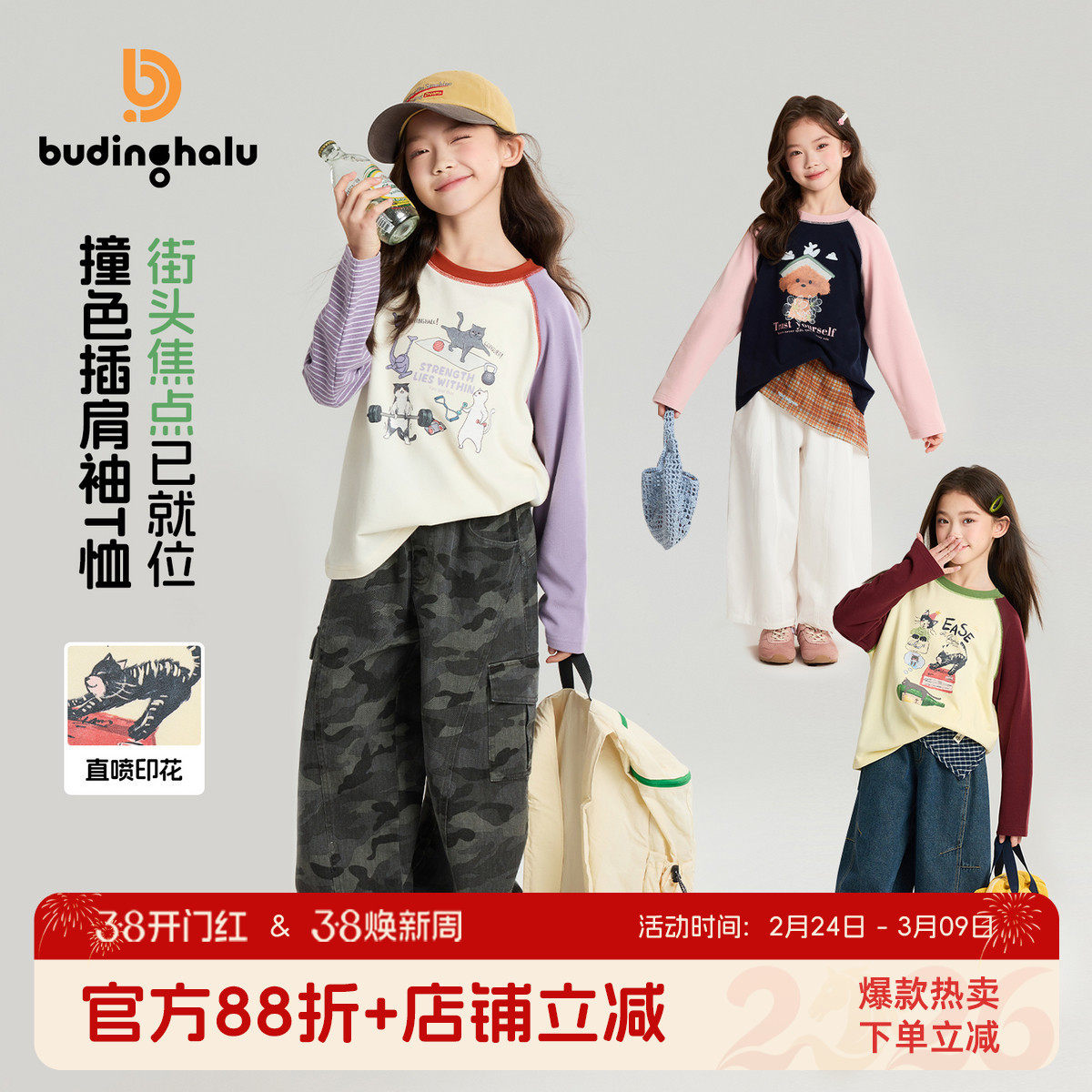 布丁哈鲁春装女童童装上衣2026春季新款儿童潮酷撞色插肩袖T恤