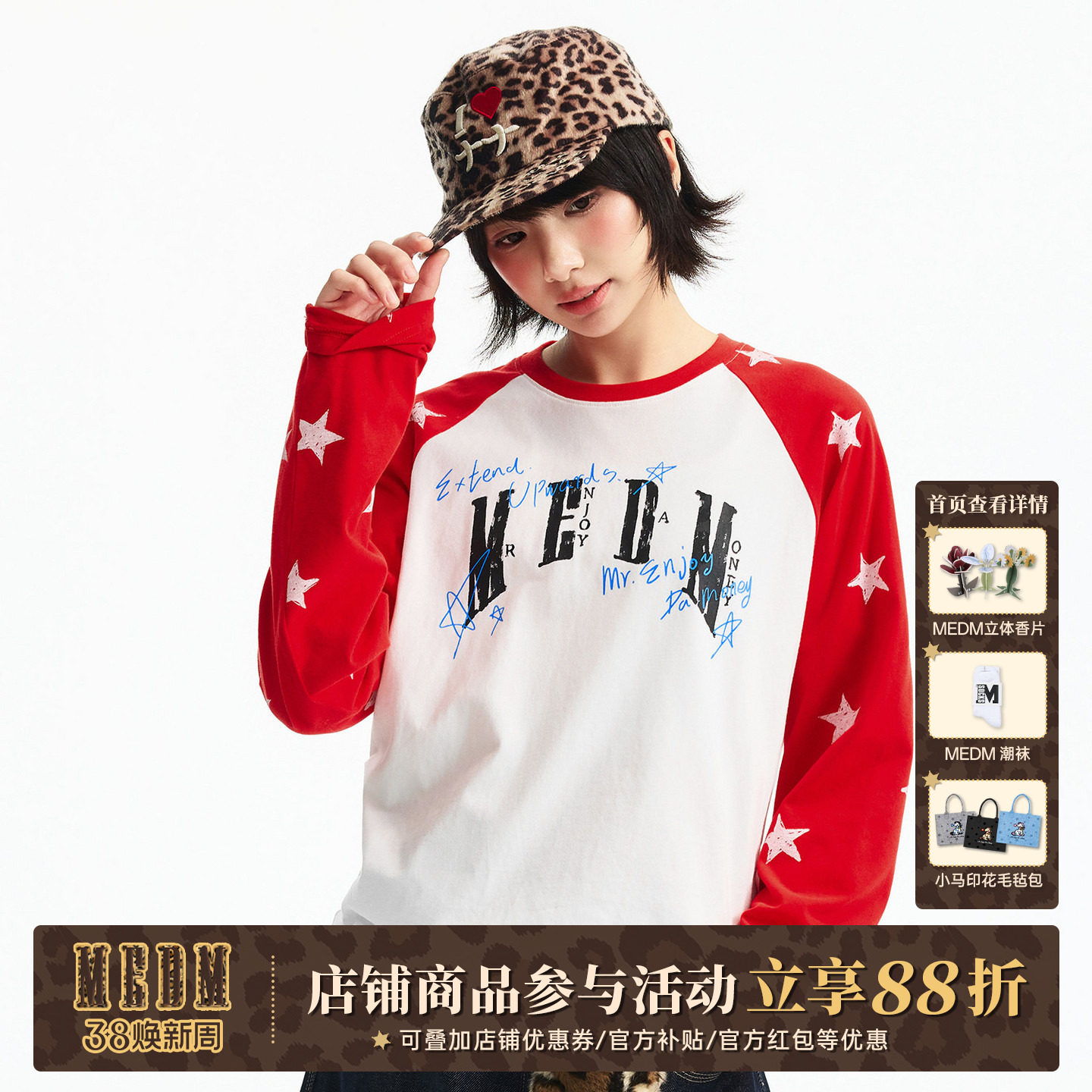 MEDM 手写涂鸦印花星星满印休闲插肩长袖T恤潮流男女同款宽松上衣