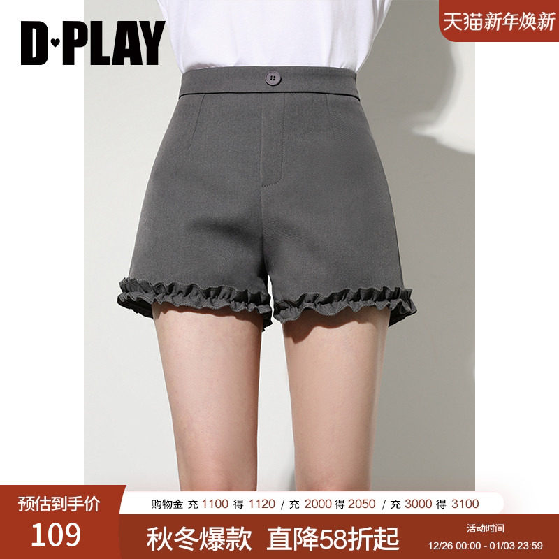 DPLAY【惠品】2025夏季新款灰色短裤女修身高腰黑色短裤花边裤子