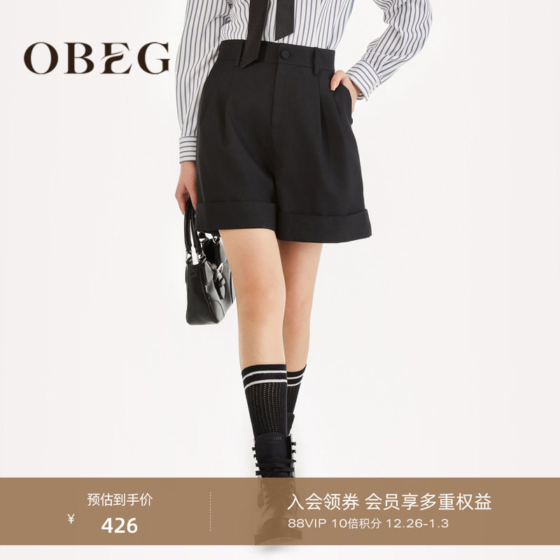 OBEG欧碧倩高腰黑色短裤毛涤精纺春秋廓形显瘦靴裤10463040