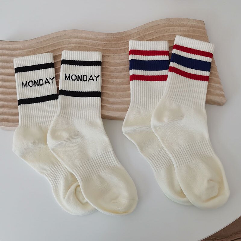 “周一美式 一周没事”原宿ulzzang运动袜子女中筒韩版条纹字母袜