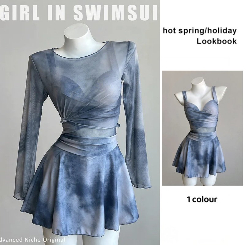 2025新款泳衣女裙式连体遮肚显瘦小胸钢托聚拢防晒长袖两件套温泉