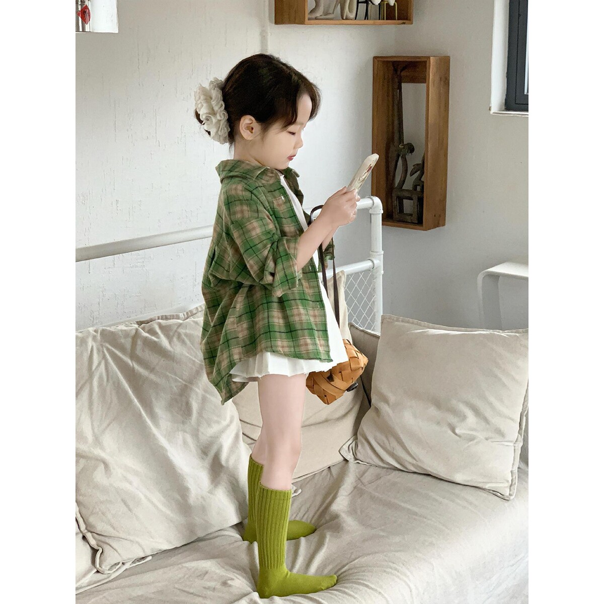 跨境童装 女童外套2026春季新款韩版少女中长款绿色格子长袖衬衫