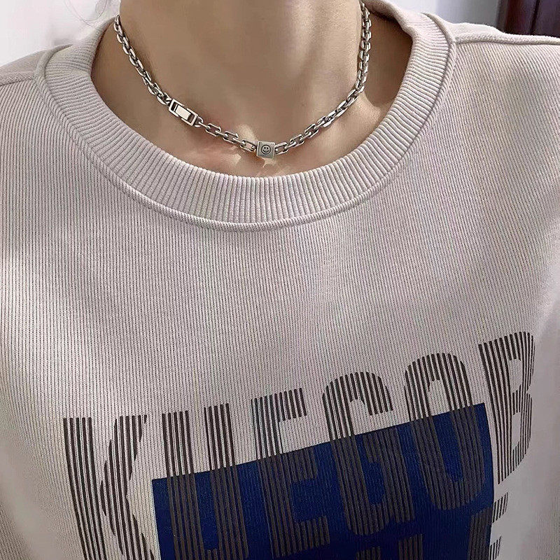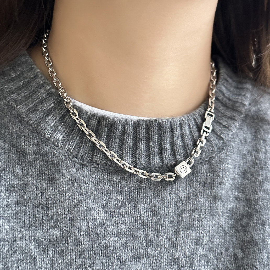 韩国新款s925镀银方块笑脸项链小众短款粗链条个性复古重工锁骨链