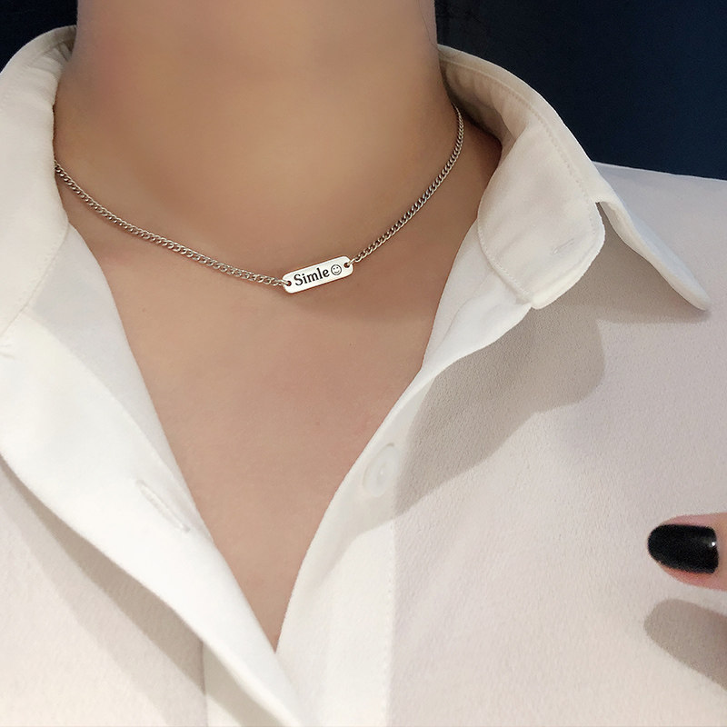 s925纯银泰银方牌simle笑脸项链女小众设计感ins简约韩版锁骨链潮