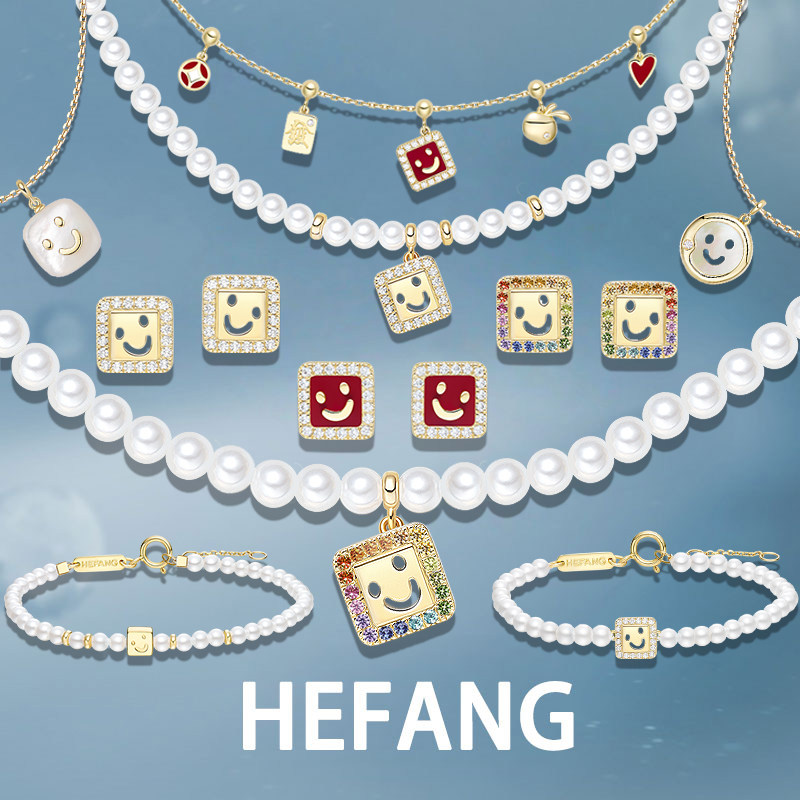 何方笑脸耳钉彩虹镀14K金轻奢HEFANG耳环五福临门套装女项链