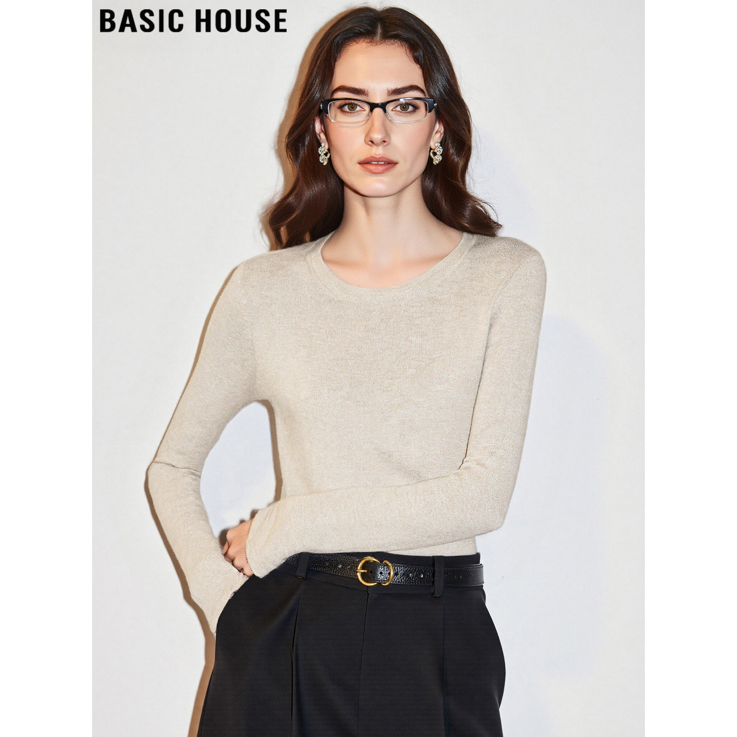 Basic House/百家好杏色圆领针织打底衫女士冬季修身软糯内搭上衣