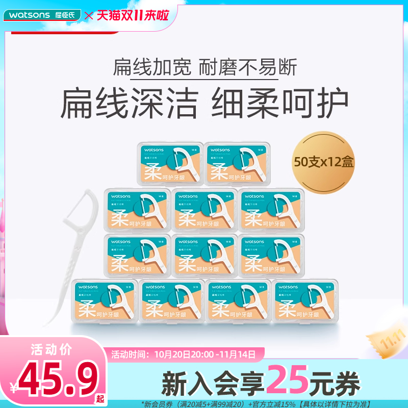 屈臣氏牙线棒细滑双线深洁护理50支X12盒家庭装新旧包装随机发货