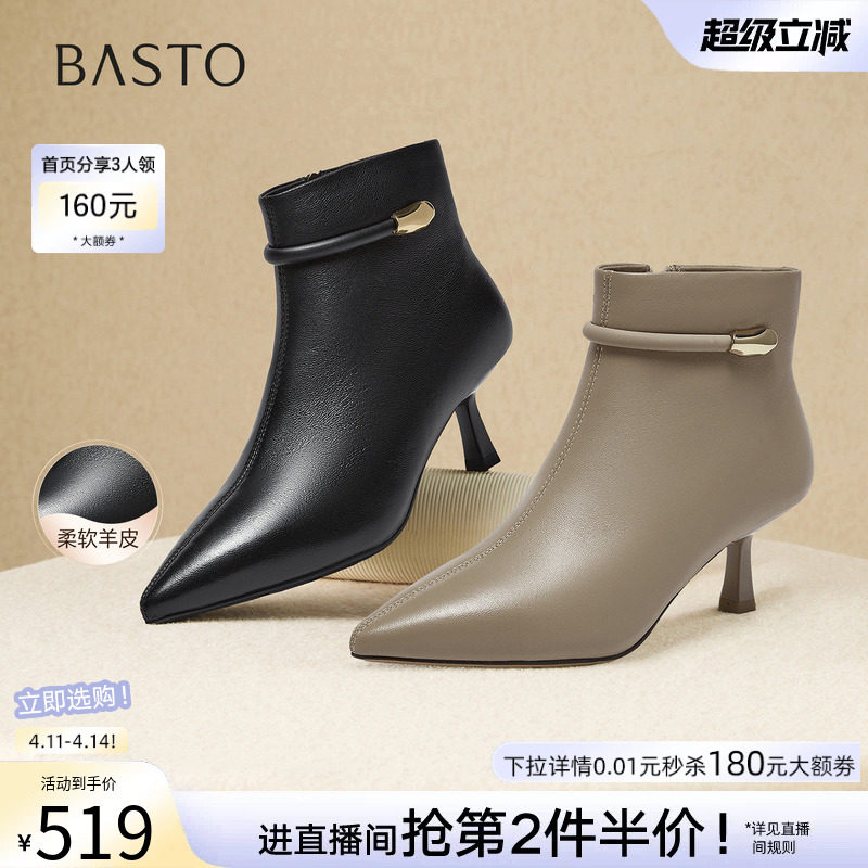 百思图冬季商场新款气质羊皮及踝靴尖头细跟女短靴K5035DD5