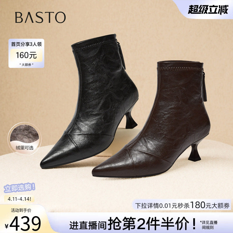 百思图冬季商场新款气质细跟尖头法式及踝靴加绒女靴W2073DD5