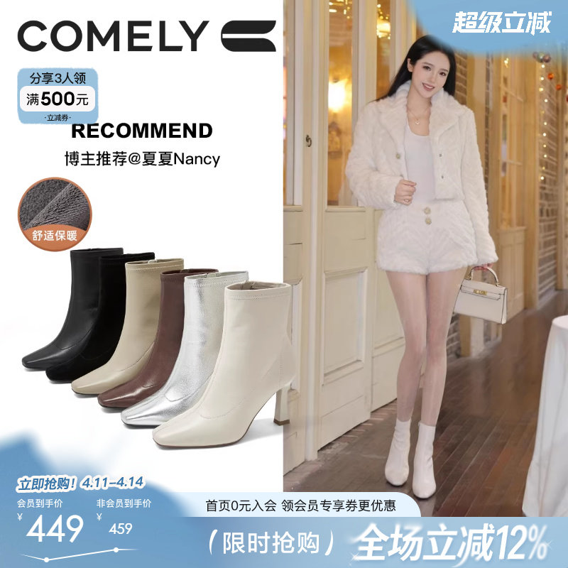 新闻女王佘诗曼同款康莉高跟白色短靴女冬新款真皮气质尖头瘦瘦靴
