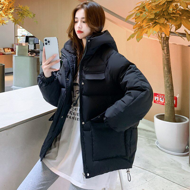 反季新款韩版冬季女装连帽百搭面包棉服学生宽松黑色中长款外套女