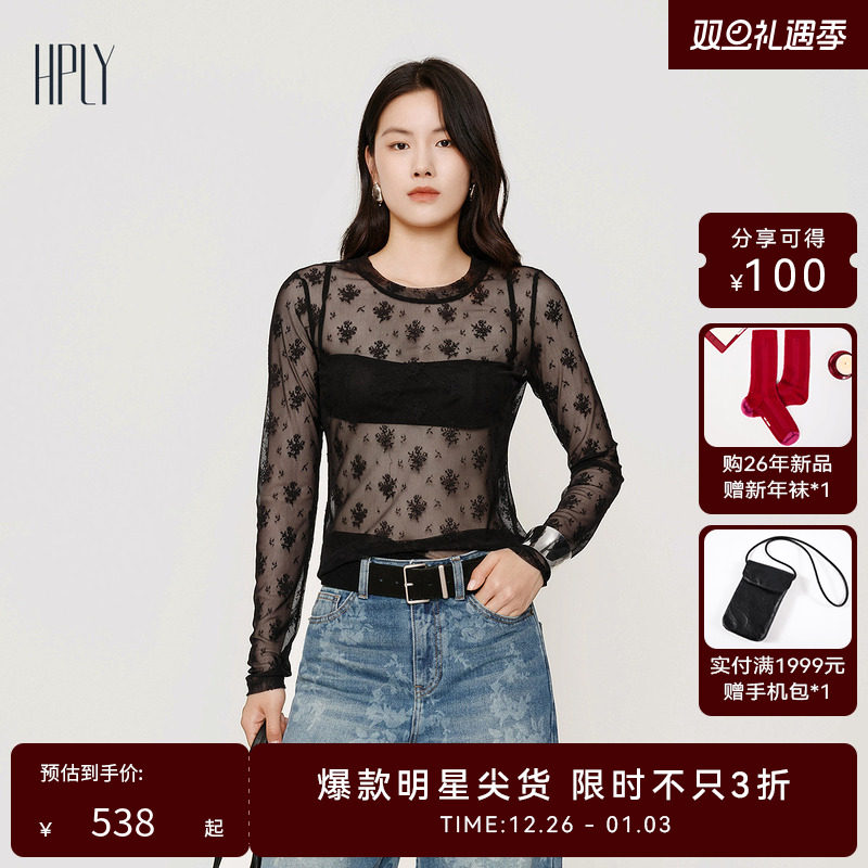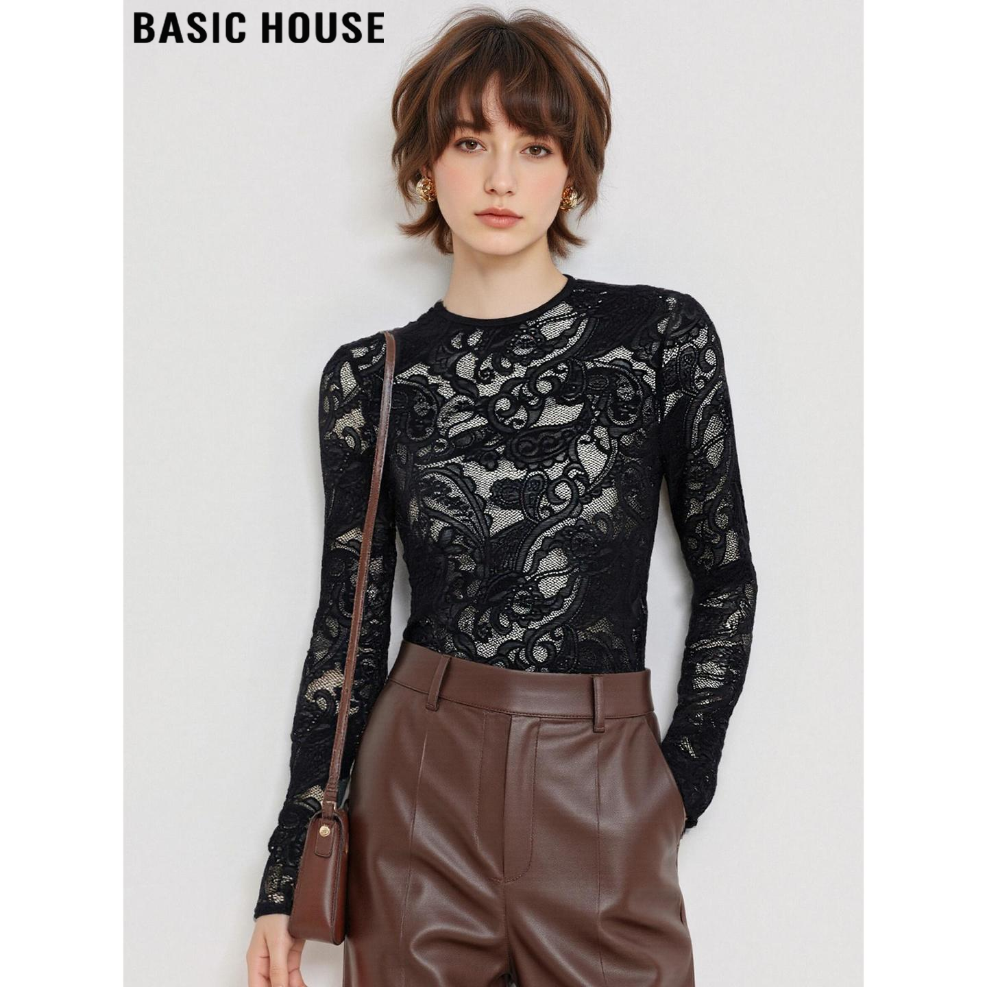 Basic House/百家好黑色蕾丝打底衫女士2026春季新款网纱长袖上衣