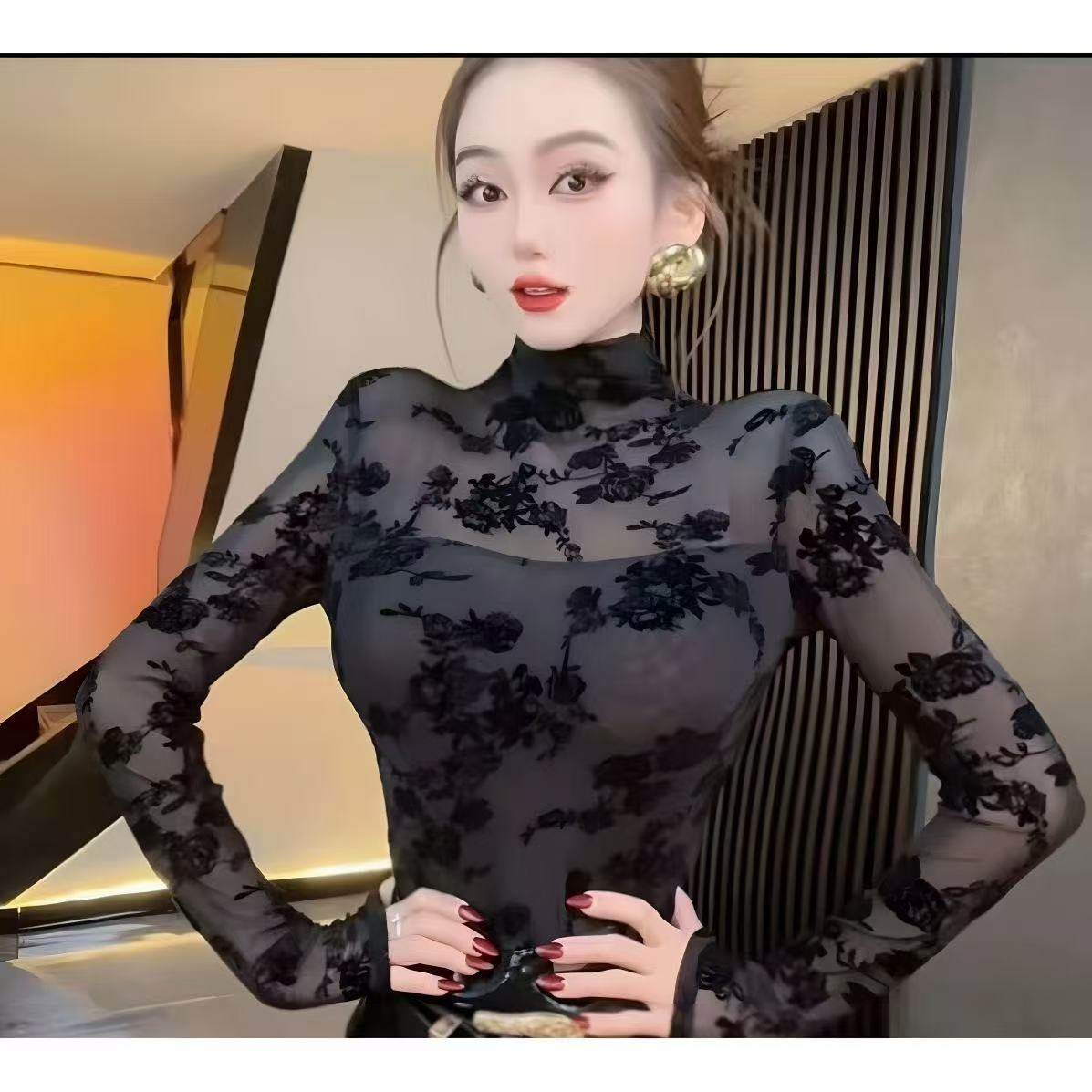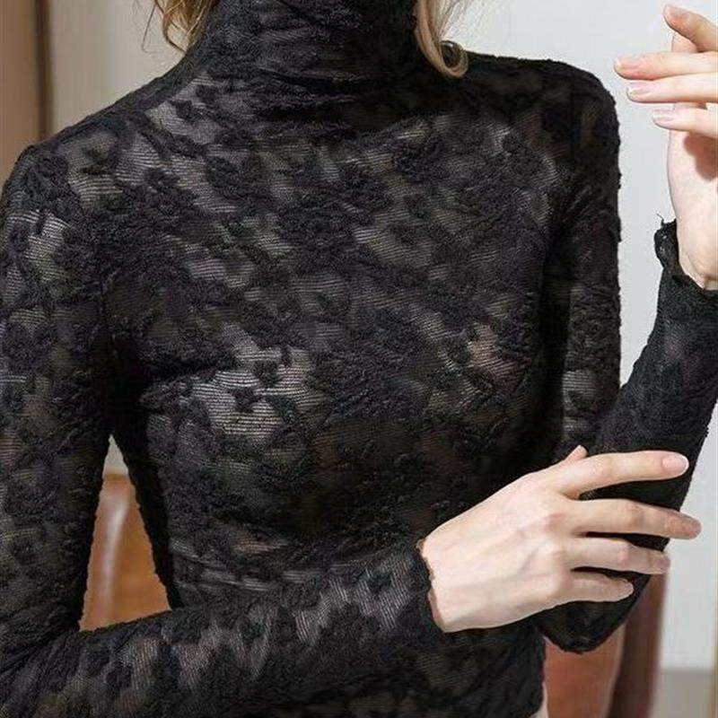 黑色蕾丝打底衫女士秋装复古洋气半高领内搭透视性感长袖网纱上衣