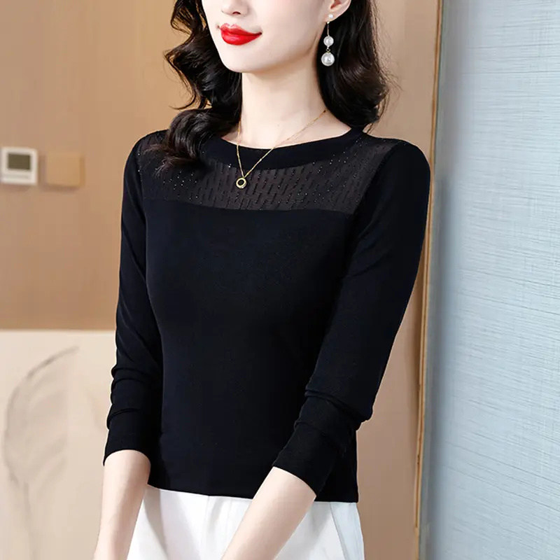 黑色蕾丝打底衫女内搭秋冬新款烫钻网纱拼接金丝绒长袖洋气上衣潮