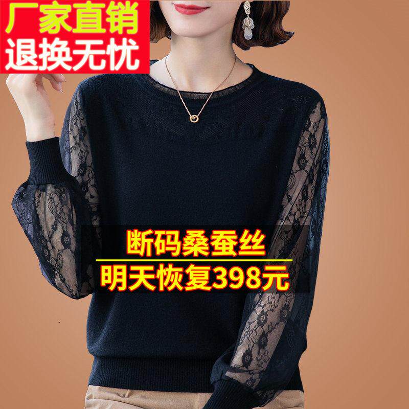 黑色蕾丝打底衫2023年春秋桑蚕丝t恤女小衫宽松长袖真丝针织上衣