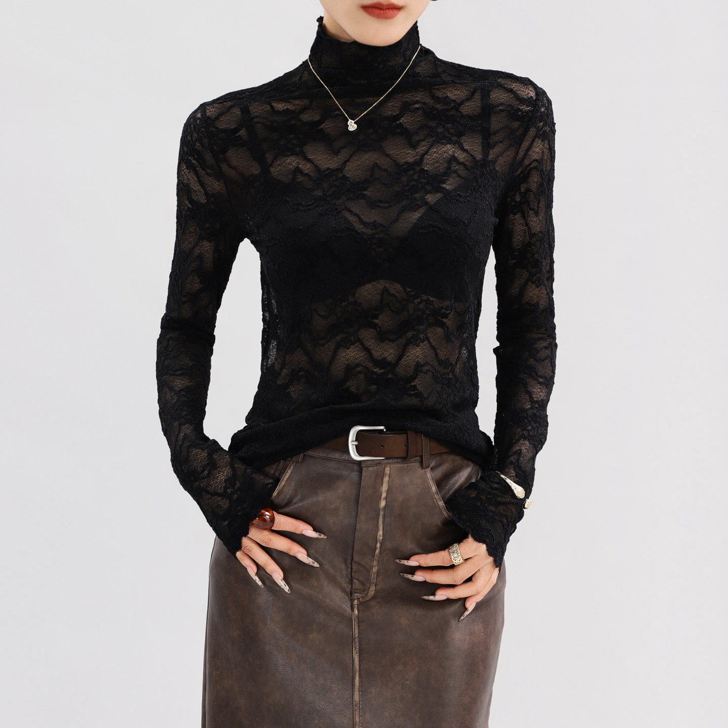 高领黑色打底衫女薄款2025新款早秋长袖高端蕾丝内搭透视网纱上衣