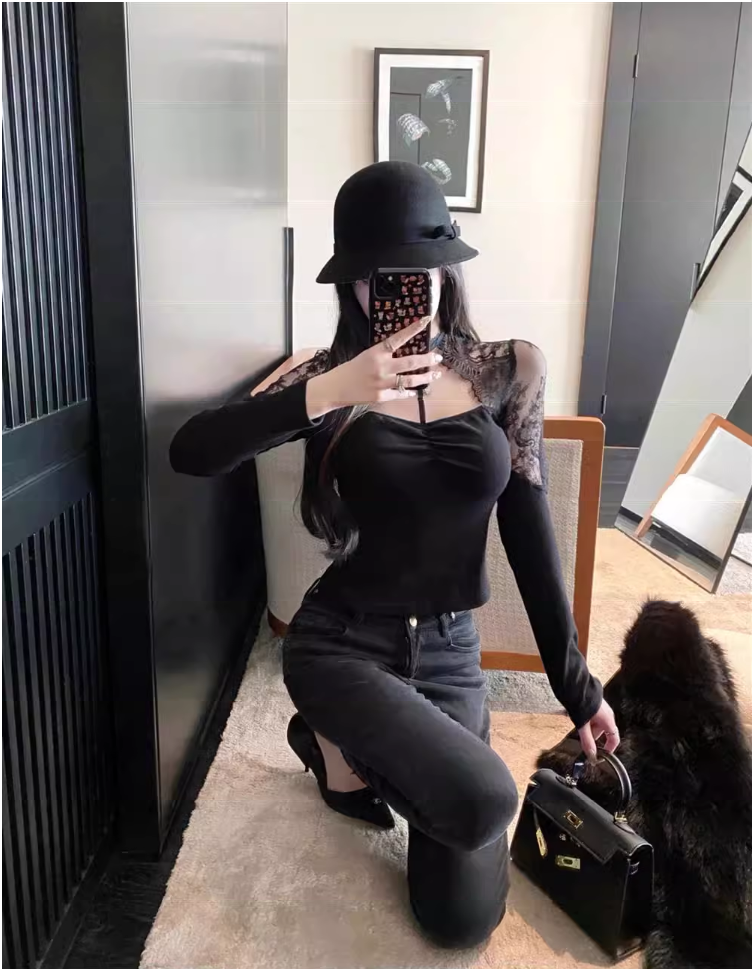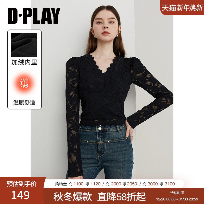 DPLAY【惠品】2025秋季新款法式黑色蕾丝打底衫女性感长袖上衣
