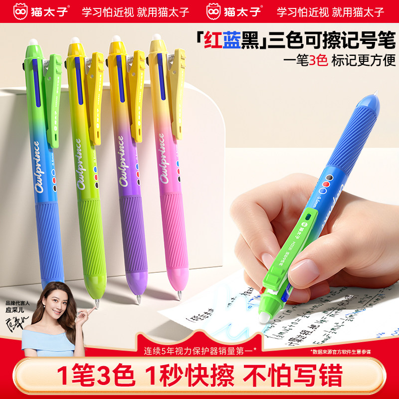 猫太子中性笔热可擦三色合一高颜值彩色蓝红色水笔黑小学生笔记热敏专用多色文具2026超火笔芯神器橡皮三色笔