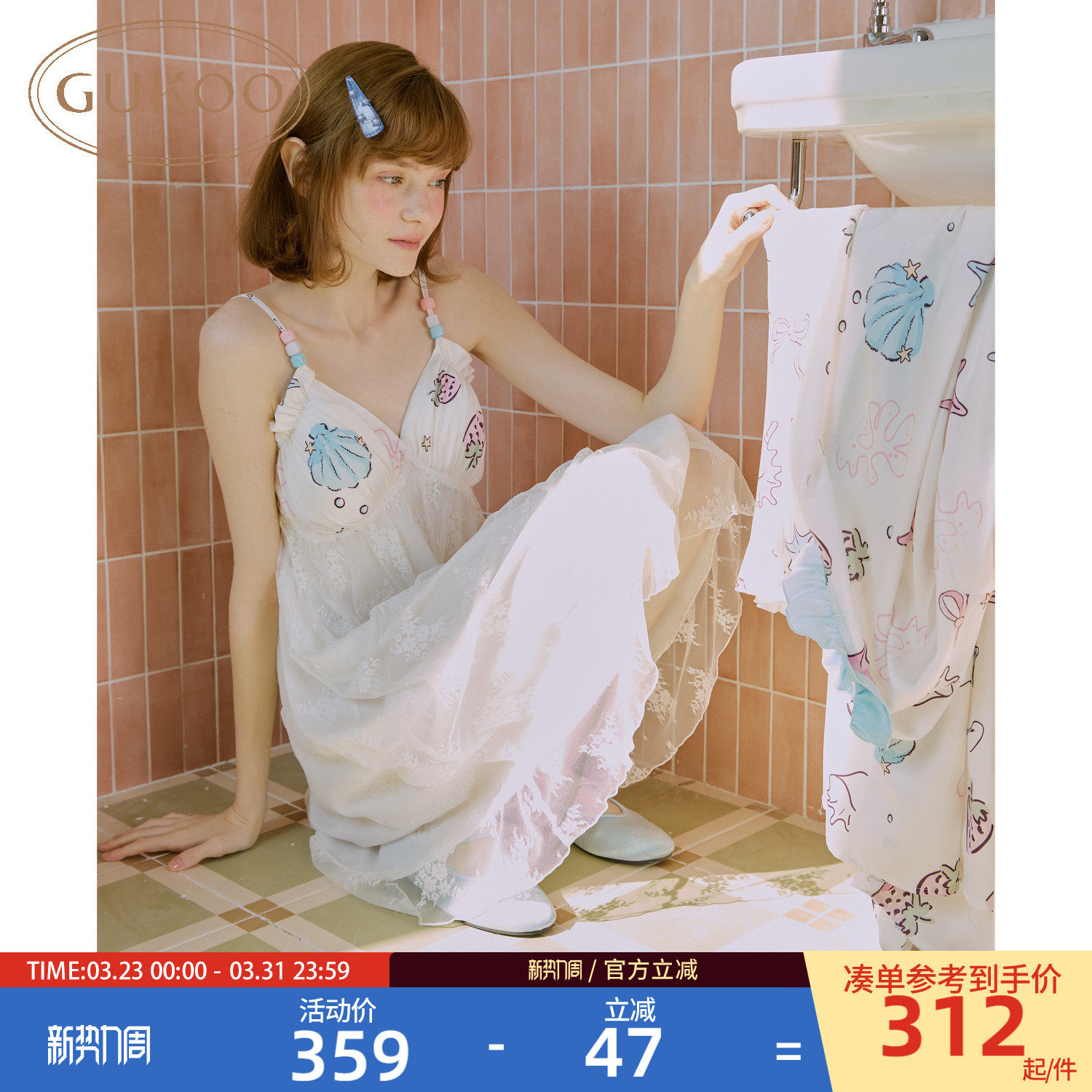 Gukoo/果壳长袖睡袍春夏小贝壳印花吊带睡裙新款女家居服两件套A