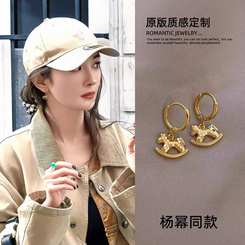 s925纯银碎冰冰小木马耳环女2025年新款本命年卡通耳钉高级感耳饰