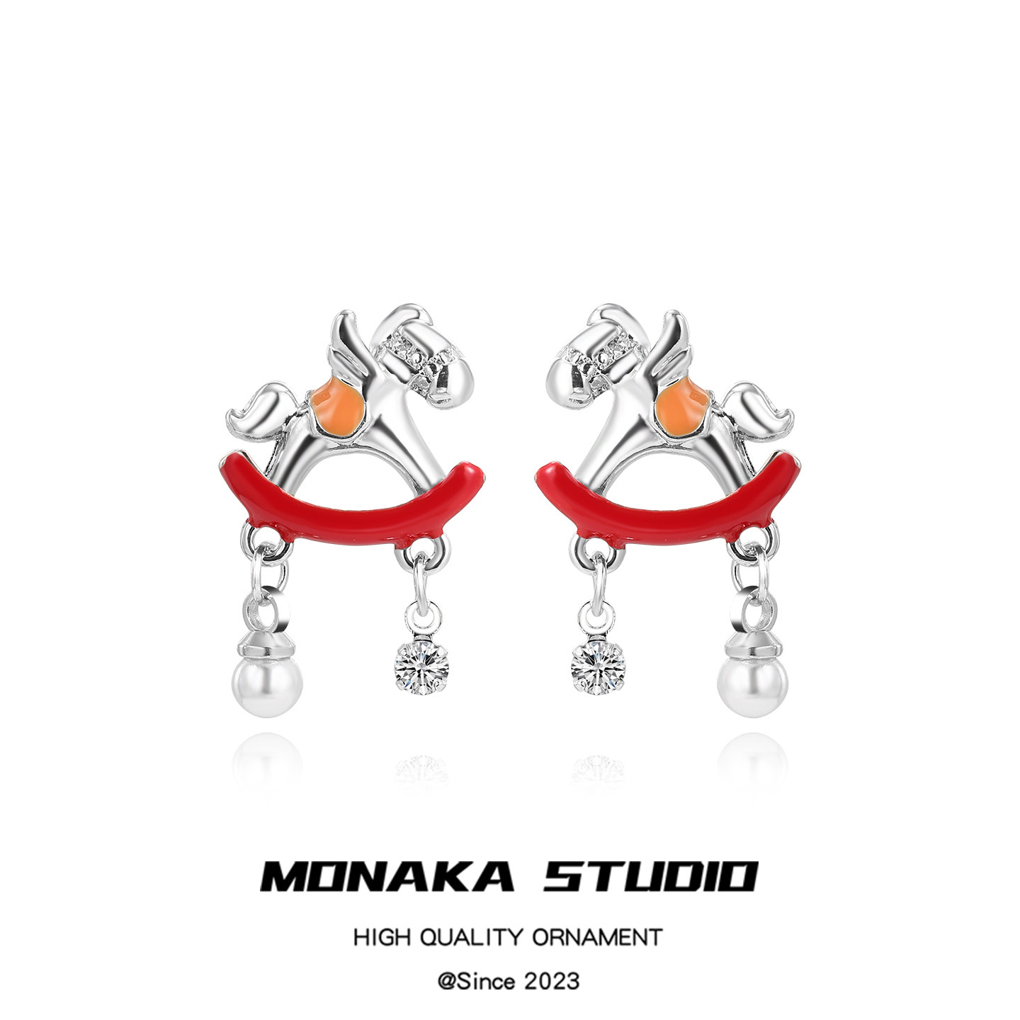 新款马年摇摇马新年卡通耳钉女银色金属珍珠锆石吊坠可爱趣味耳饰