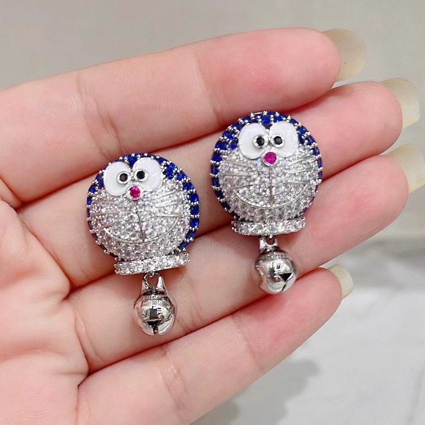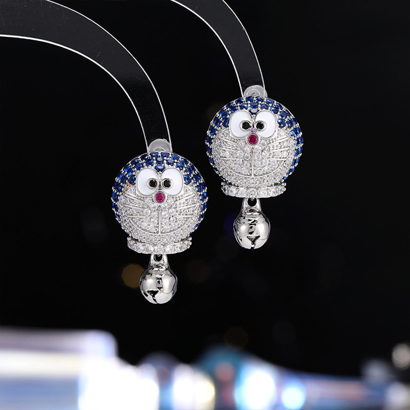 个性创意叮当猫可爱卡通耳钉女s925银针微镶满锆奢华甜美重工耳饰