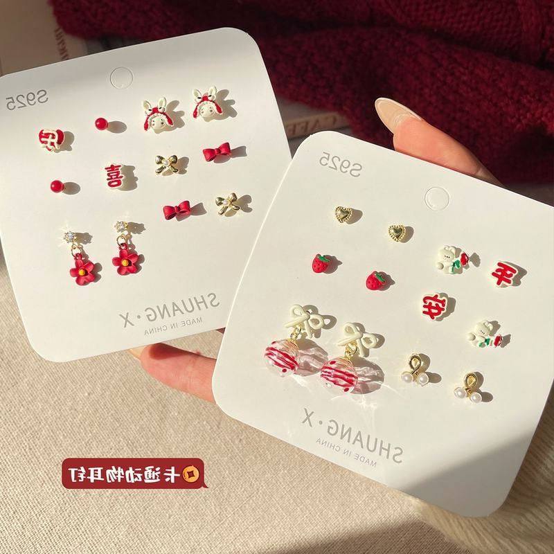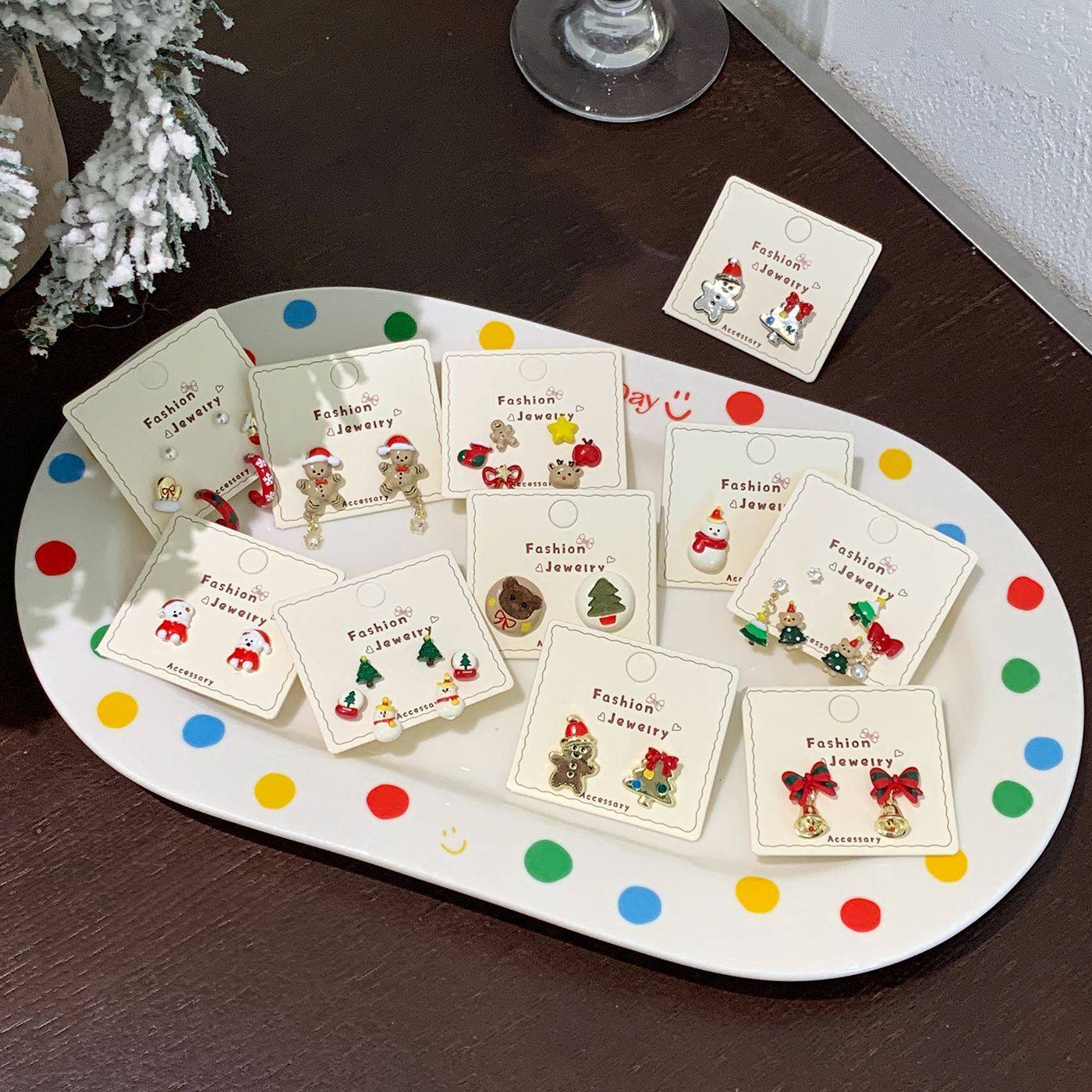 圣诞节卡通耳钉节日小熊铃铛麋鹿雪人圣诞树耳饰新款学生耳环套装