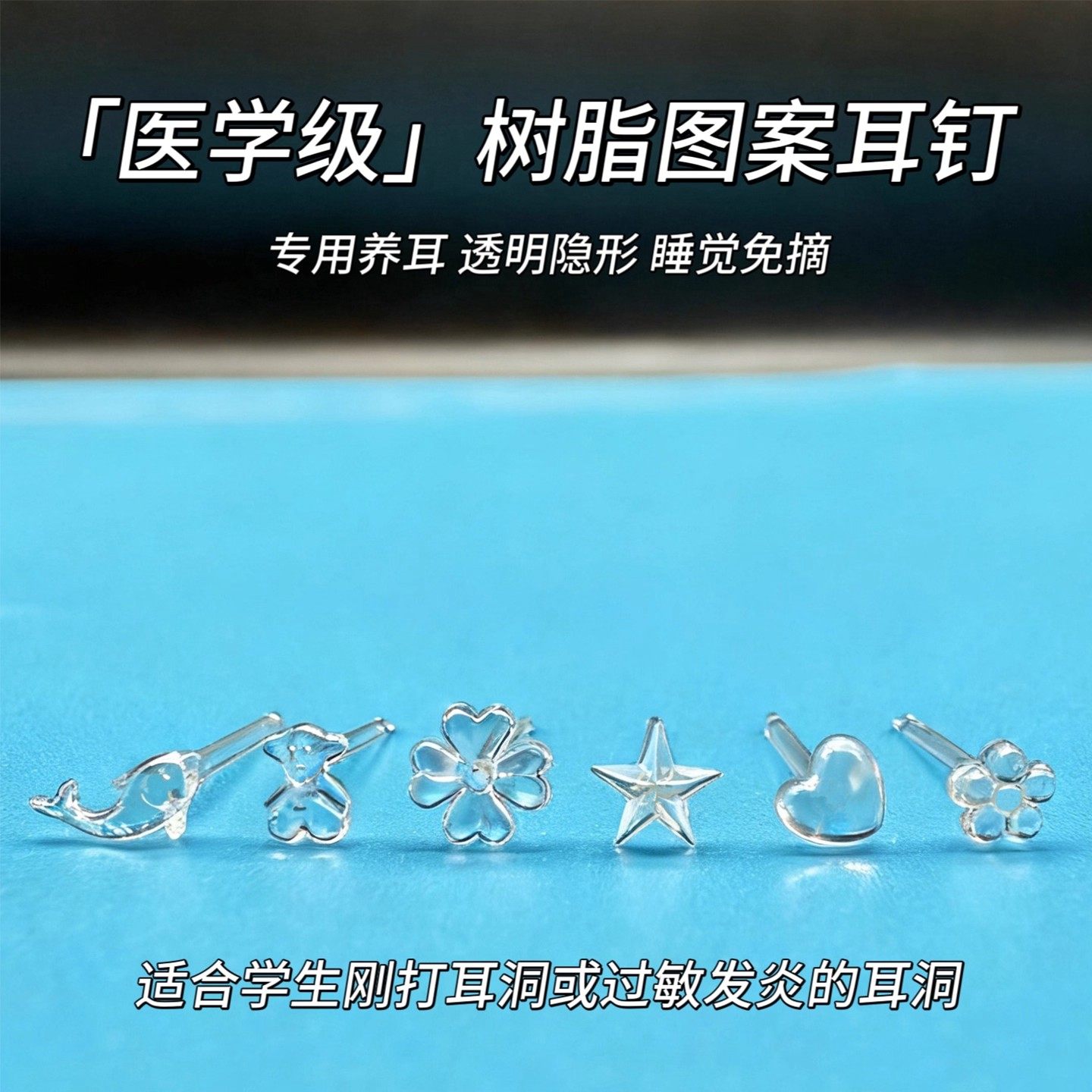 防堵过敏隐形塑料爱心图案卡通耳钉女透明养耳洞耳针百搭学生免摘