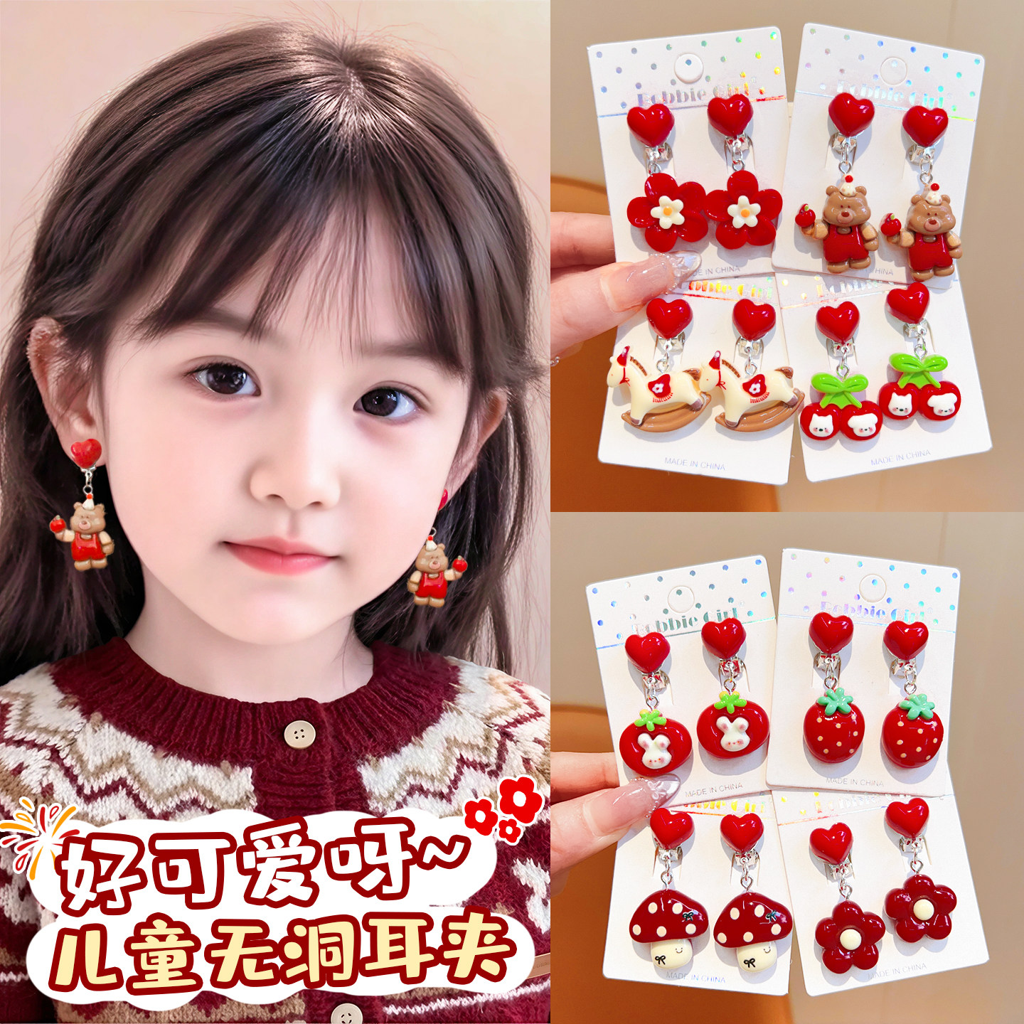 女孩红色小马耳夹花朵卡通耳钉软垫防痛耳坠宝宝新年礼物儿童耳环