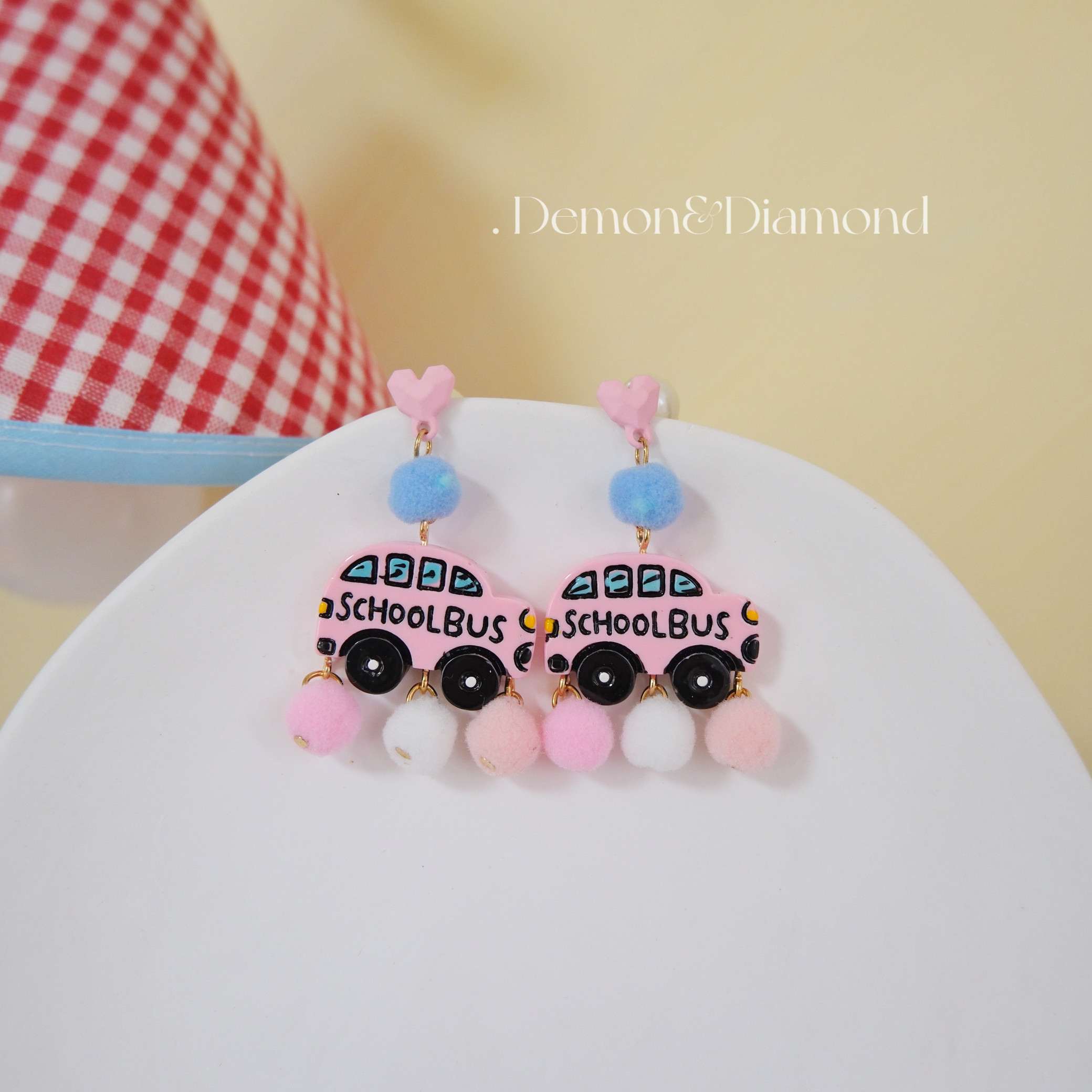 【买3免1】韩单爱心粉色巴士梦幻小汽车简约卡通耳钉耳夹925耳环