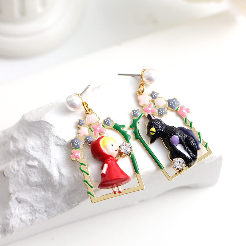 复古甜美卡通耳钉耳夹经典小红帽大灰狼系列不对称耳坠小众ins风